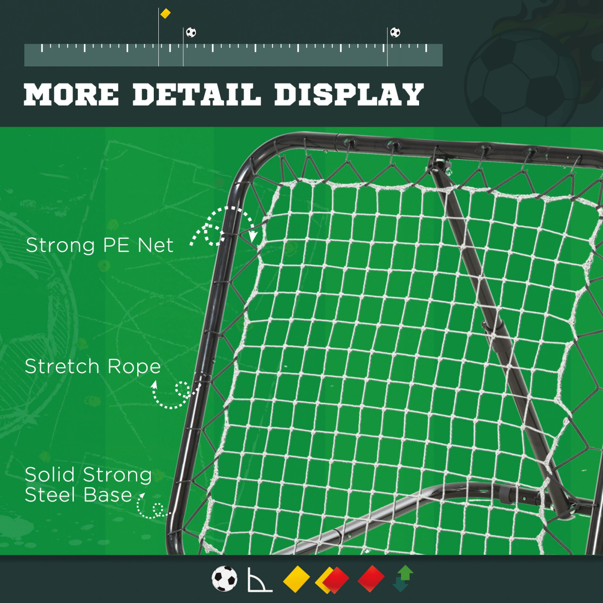 WIDE USE: Applicable for football, baseball training. Can be used for a variety of exercises to improve reactions, hand or foot eye co-ordination, improve kicking, catching, passing, throwing, hitting.DRUABLE CONSTRUCTION: Made of good quality black power coated iron tube(Q195) and all weather PE net, the rebounder net can bear intense impact during your training.ADJUSTABLE ANGLES: Allows you to adjust the angle to meet the different training demands as a rebound net. Includes stability anchors to prevent toppling when in use.PORTABLE DESIGN: The rebounder net is lightweight and can be folded flat so that you can take it anywhere as you like, such as sports club, school, garden, and backyard.DIMENSIONS: Overall Dimension: 78L x 84W x 65-78H cm. Folded Size: 84L x 84W x 11H cm. Net Size: 63L x 63W cm. Mesh Size: 4.5L x 4.5W cm.