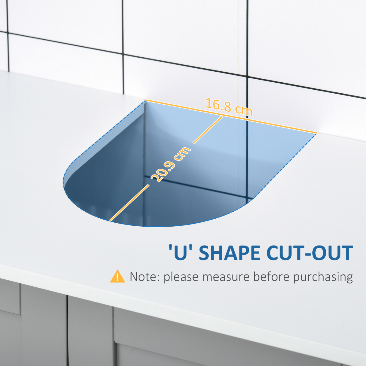 'U' shaped cut-out slots in easily underneath your sink (please measure before purchasing)